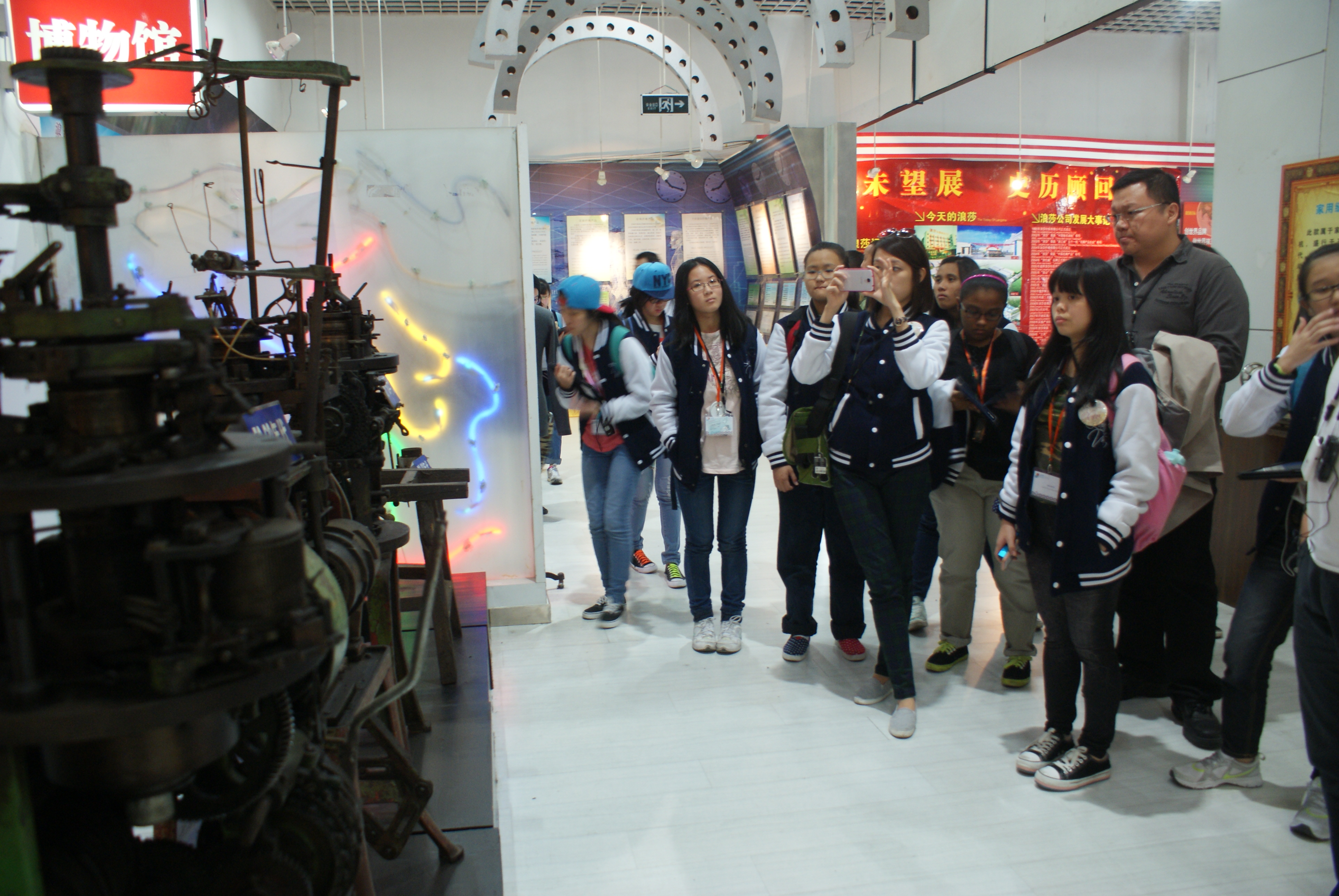 歐南中學生代表團先來到了浪莎產品展覽中心。它由浪莎文化墻、浪莎科技館、浪莎博物館、浪莎樣品展示區、商品直銷區等部分組成。浪莎文化墻展示了義烏市場的演變和浪莎企業文化。其中,浪莎管理的“7個理念”,是精髓部分,尤其是一個目標“爭創世界品牌產品”,兩個戰略“穩扎國內、拓寬國際”對浪莎的成長具有指導意義。